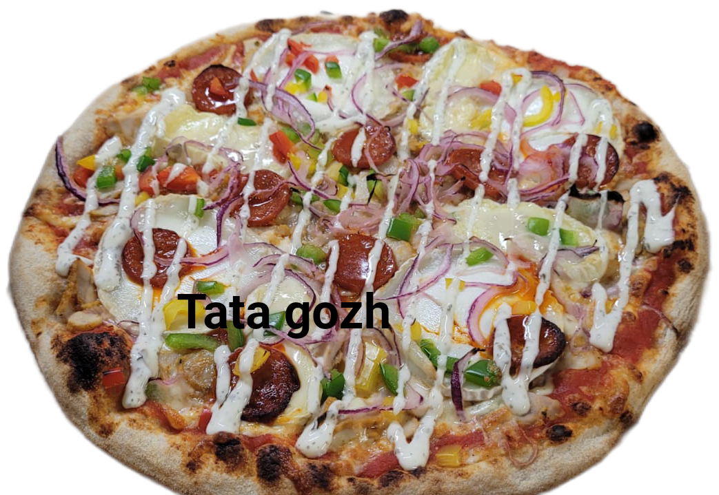 Pépère : Tomate*, mozzarella*, champignons, merguez, lardons, oignons, poivrons, crème fraîche : 11,50 €